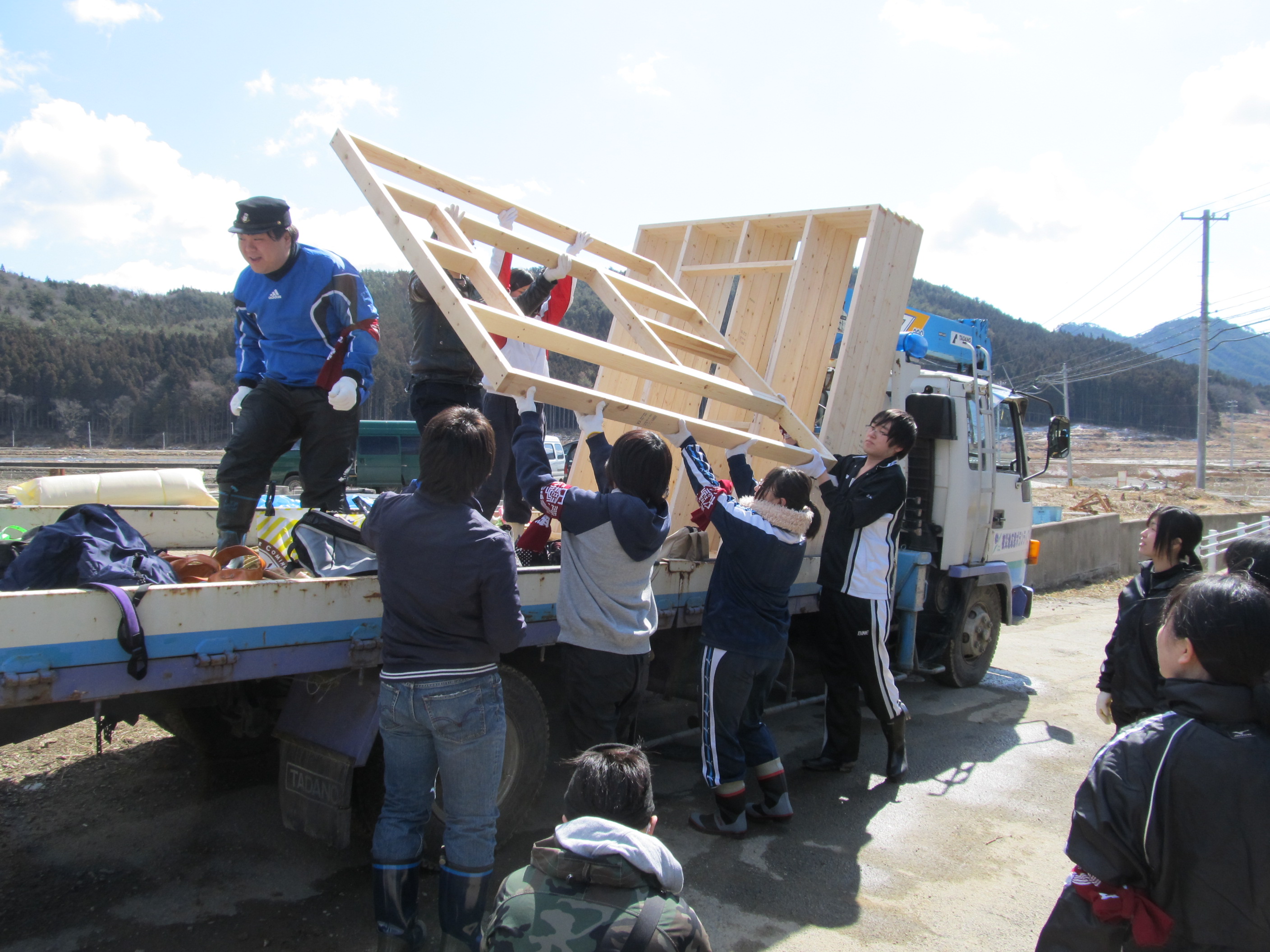 南三陸町では3戸目となる今回は「宮城県遊技業協同組合」から支援をいただき設置することができました。ありがとうございます。設置の際もお手伝いいただき、さらに今回は早稲田大学の学生の方達にもご協力いただきました!たくさんの方にお手伝いいただき、早く完成させることができました。